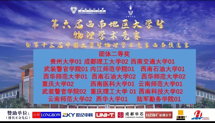 2022年7月16-19日,受防疫政策影响,由教育部高等学校物理学类专业教学指导委员会西南地区委员会、四川、重庆、贵州、云南四省市物理学会主办,云南师范大学承办的第六届西南地区大学生物理学术竞赛暨第十三届中国大学生物理学术竞赛西南预选赛(含西南地区26所高校,共46支代表队)在线上举行。经过三轮对抗,FB体育(中国)官方网站-FB SPORTS2支代表队表现出色,分别获得团体一等奖和团体二等奖的好成绩,成功拿到了第十三届中国大学生物理学术竞赛的入场券,成为2022年西南地区进军国赛的7所高校(含经上一年度选拔直接进入国赛的种子队高校)之一。