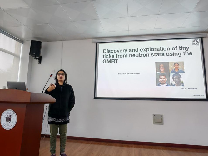 2024 年 12 月 12 日上午 10 点至 12 点,一场精彩的学术报告活动于博学楼 427 会议室举行。印度浦那国家射电天文中心(NCRA)副教授 Bhaswati Bhattacharyya 带来了题为 Discovery and exploration of tiny-time-ticks from neutron star laboratories using the GMRT 的报告,约30 名对中子星研究充满热情的老师、研究生参与了此次活动。张立云教授主持报告。