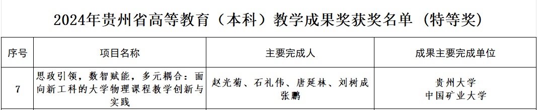 由我院国家级一流课程负责人赵光菊教授团队完成的“思政引领、数智赋能、多元耦合:面向新工科的大学物理课程教学创新与实践”项目经过严格评审,从全省众多申报项目中脱颖而出,荣获贵州省高等教育(本科)教学成果奖特等奖,是全省理科类唯一获特等奖的项目。这是我院首次获此殊荣,这一突破性成绩标志着我院在本科高等教育教学创新改革领域实现历史性跨越,我院将以此为契机,继续深化教学改革,推动我院教学高质量发展。