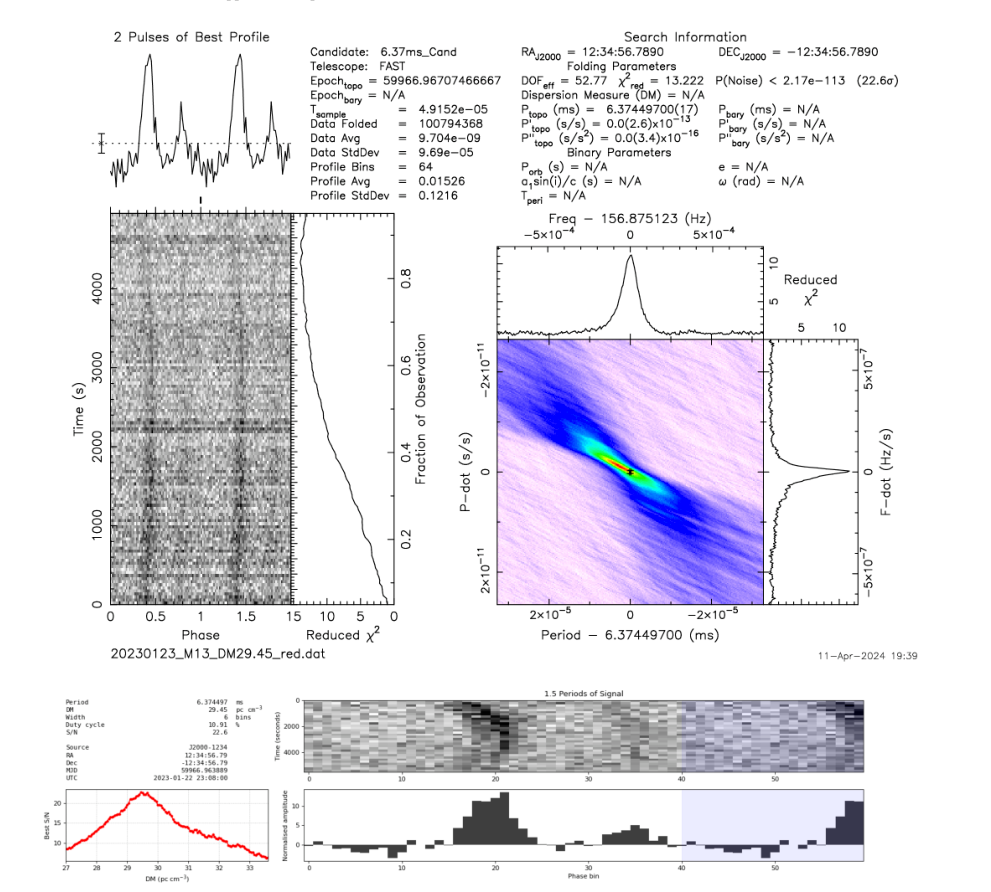 球状星团是由大量恒星高度聚集形成的古老恒星系统,其恒星整体密度极高,其中心区域的恒星密度可达太阳周围恒星密度的数万倍。由于在球状星团中已发现大量脉冲星,且其致密的恒星环境与演化特性利于脉冲星形成或留存,因此它也被学界称为“脉冲星工厂”。此前FAST的球状星团脉冲星巡天使用的搜索方法是基于快速傅里叶变换的频域搜索方法。该方法会将一部分能量分散到谐波中,同时对自转周期大于100毫秒的脉冲星存在灵敏度损失。快速折叠算法则是基于时域搜索方法,没有能量损失,理论上对任意周期性信号的灵敏度优于快速傅里叶变换。近两年来,团队采用快速折叠算法对 FAST 既往巡天数据开展了系统性重新搜索:一方面,对已知脉冲星的探测率高达 95%,验证了该算法的可靠性;另一方面,成功发现 1 颗新的毫秒脉冲双星(M13I,详见图 1)。此外,团队还利用 FAST 长达 6 年的持续观测数据,进一步获得了 M13I 的相位连接计时解(详见图 2),为后续研究其轨道特性与物理本质提供了关键数据支撑。